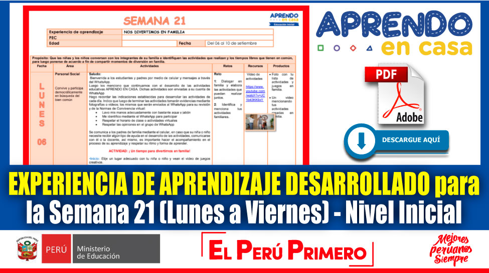 Excelente EXPERIENCIA DE APRENDIZAJE DESARROLLADO para la semana 21 (Lunes a Viernes) de Nivel Inicial [Descarga aquí]